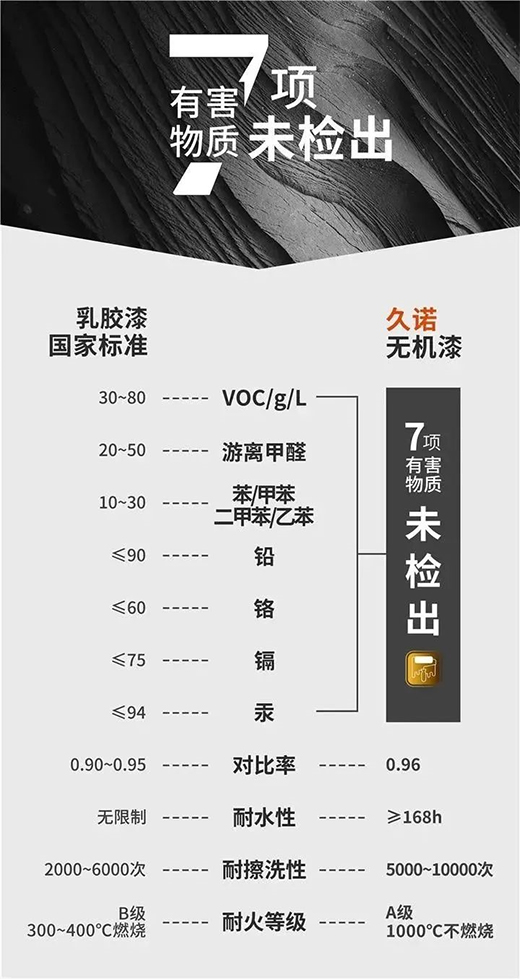 久諾在無機領域一馬當先。首先,它并沒有制造環保焦慮,而是用實踐告訴你,他們從原料、從源頭就踐行環保、無機的理念——“從原料,就環保,為時代探領更高端的涂裝選擇。”解決完源頭的取材問題,接下來就是試驗與論證了。經權威認證,久諾無機涂料產品中VOC、游離甲醛等7項有害物質未檢出。沒有浮夸的口號,更多的是與消費者認真的溝通交流,讓更多消費者記住“無機”這個詞。