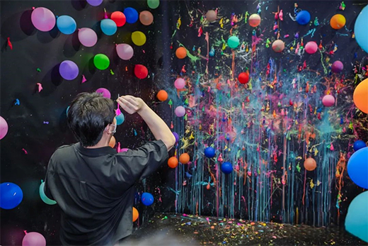 另外,在此次家博會立邦展館的設計中也深度融入了游戲的元素。最直觀的便是互動創作區,現場觀眾可直接參與互動游戲,用飛鏢射擊裝有乳膠漆的氣球,被擊破的氣球中的乳膠漆將隨即噴灑在墻面上,最終形成參觀者+品牌共創的“無意識藝術盛舉”。
