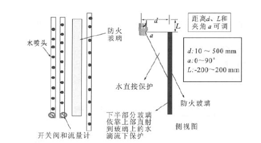 國內外的相關實驗表明選擇適當的水噴淋系統保護可以有效延長防火隔熱時間,確保人員疏散。目前此種設計大量應用于大型商業步行街等性能化設計中,由單片非隔熱型防火玻璃加水噴淋系統保護起到隔熱作用。此類工程做法中最關鍵的是噴淋保護的布水效果,因為實驗表明一旦失去噴淋保護單片防火玻璃將很快失去防煙隔火的作用。