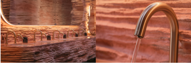 敦煌“凈界”衛生間,凝練大漠風光與人文符號,雅丹地貌的磅礴氣韻融入空間造型,提取敦煌專屬色彩與美學肌理,功能之上再造文化地景。雅丹的曲線遇見拉斯凱撒金的輝光,九牧定制敦煌色系龍頭、地漏、紙巾盒,流淌出敦煌的韻律與現代的潔凈,延續千年不絕的文明星火。