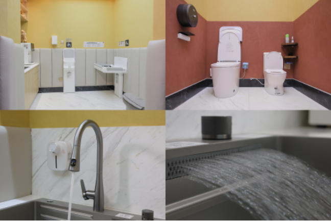 茶歇區配置九牧多功能水槽,集砧板、置物槽、瀝水板、洗杯器及感應抽拉龍頭等一體式設計,便利沖洗,分區操作,讓游客暢享舒適。母嬰室配備嬰兒護理臺、嬰兒座椅、水槽,第三衛生間、無障礙衛生間人性化設置兒童小便器、兒童馬桶及各類扶手,讓不同群體都能在此從容如廁。