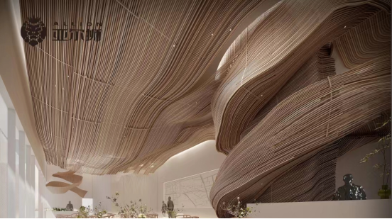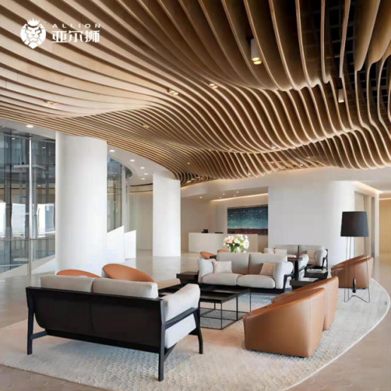 亞爾獅鋁制品定制專業的設計人員根據裝修空間及工程要求,打造吊頂波浪弧形鋁方通和木紋鋁方通,線條明快飄逸,層次分明,堅固耐用。鋁方通吊頂使長形空間不再因為距離而產生局促感,簡潔而不呆板,充足的光感與次序感,更使空間充滿時尚氣息。