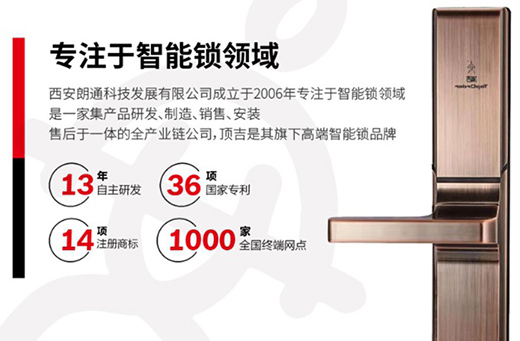 頂吉智能鎖是西安朗通科技發展有限公司旗下的品牌,公司擁有自主知識產權專利36項,并獲得14項國家注冊商標。頂吉·無孔智能鎖獲得了國家科技部和省、市科委的大力支持,安全性經國家公安部檢測中心檢測獲得最高級別認證,榮獲公安部最高防盜級別認證。