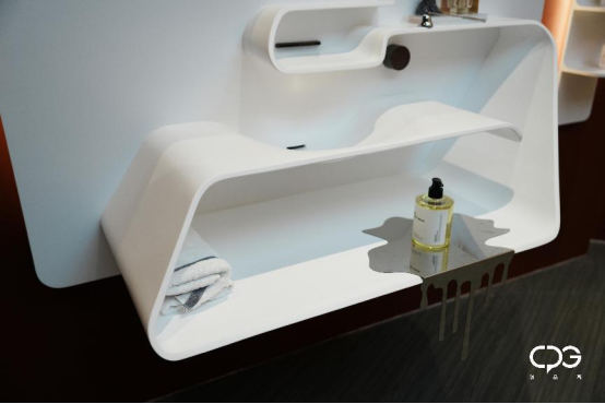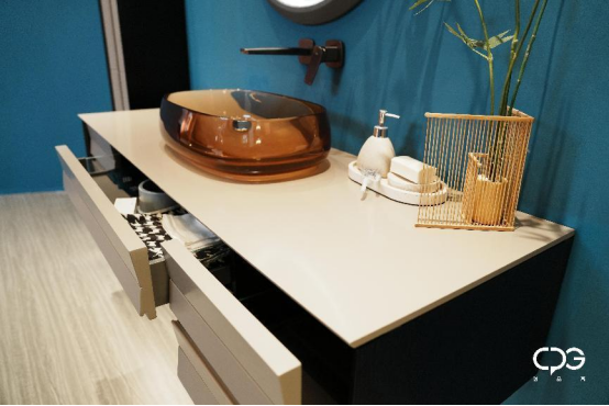 這次展示的部分新品浴室柜,更是以人造石+木材的形式來呈現(xiàn)CPG創(chuàng)品高全案衛(wèi)浴的獨(dú)特美學(xué)。剛硬的人造石與溫潤的木,兩種截然不同的材質(zhì),結(jié)合多重技術(shù)和工藝,在CPG創(chuàng)品高全案衛(wèi)浴的獨(dú)特設(shè)計下,展現(xiàn)出協(xié)調(diào)和諧的剛與柔的交融相依,在全新的角度下,勾勒出獨(dú)屬于CPG創(chuàng)品高全案衛(wèi)浴的極簡美學(xué)。