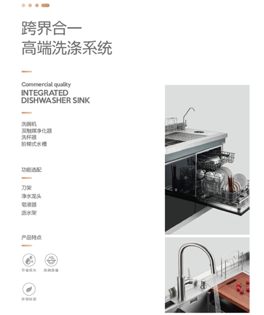 AX6009創新型一體式集成水槽是不同于傳統水槽的多功能水槽,除了水槽部分外,還配有獨立的8套嵌入式洗碗機、可選配自動垃圾處理器、洗杯器等系統和功能。新產品所配有的洗碗機分層設計,疊放自如,具有紫外線滅菌、自動烘干等功能,一鍵式輕松搞定洗碗問題,不再為洗碗而煩惱。自動垃圾處理器噪音低、粉碎凈,讓飯后殘余垃圾粉碎排出,零堵塞更環保。槽體的另一側配有獨立的洗杯器,讓清洗水杯、奶瓶、酒瓶更易潔方便。諾帝瑪廚衛只有你想不到的,沒有他們做不到的,敢于挑戰,敢于書寫,拒絕同質化發展。