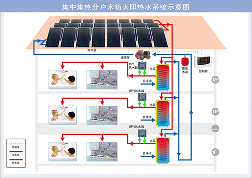 而分戶儲熱,是在集中儲熱的基礎上,增加的一道儲水設備,每一戶住宅都配備一個小儲水箱,讓業主也可以獨立管理熱水。同時每戶都配有燃氣熱水器,與太陽能熱水配合運作,以保證自家的熱水供應穩定,熱水循環泵在其中依然發揮著水管內循環熱水的作用。