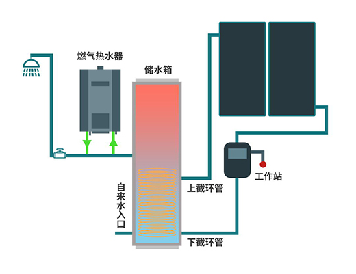當天氣晴朗、日照充足的時候,太陽能收集熱量儲存在水箱中,直接供給住戶使用,大大節約能源。天氣狀況不好時,燃氣熱水器開始加熱,保持穩定供應恒溫熱水。