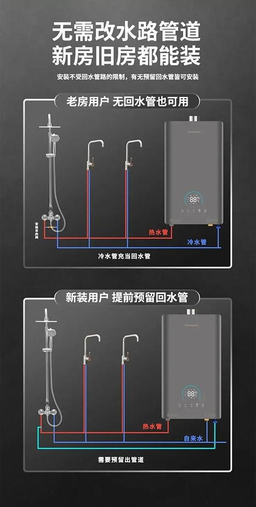 HX221A零冷水熱水器突破房屋管道布局限制,新房老房均可安裝,讓您無(wú)需擔(dān)憂(yōu)安裝難題。新房裝修可以提前預(yù)埋回水管,使全屋做到零冷水、零等待;而老房想要換新機(jī),也無(wú)需改造水管線(xiàn)路,只需在離熱水器最遠(yuǎn)的浴室加裝單向閥,即可實(shí)現(xiàn)全屋零冷水效果。