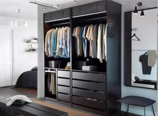 如果你很幸運有個小房間,與其塞得滿滿,鑿開墻壁擠出那么點空間,一邊利用層板,一邊布置衣架,不只可以擺放衣物,還可以在抽屜內收納一些零星細碎的小物件。開放式的設計不會阻斷空間,十分節省面積。簡單框架結構、深木色是否是熱愛文藝的你所喜愛的呢?