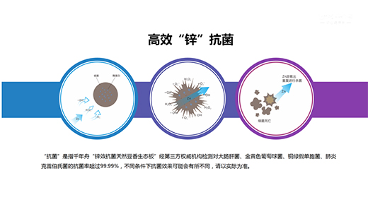 鋅效抗菌天然豆香生態(tài)板中的鋅離子抗菌極其穩(wěn)定,不易氧化變色失效,抗菌持續(xù)的時(shí)間更長(zhǎng)、抗菌起效條件不受光照影響,24H全天候抗菌。同時(shí),鋅效抗菌天然豆香板抗菌材料經(jīng)急性經(jīng)口毒性測(cè)試結(jié)果為實(shí)際無(wú)毒級(jí)物質(zhì),并且經(jīng)一次完整皮膚刺激性試驗(yàn)結(jié)果無(wú)刺激,抗菌更安心。