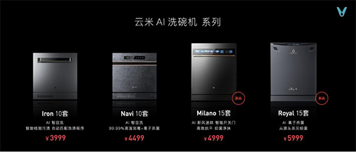 ?云米AI洗碗機系列,除了有省電和省時兼備的Milano 云米AI洗碗機(15套)外,還有Iron 洗碗機,AI 智目洗,智能檢測污漬,自動匹配洗滌程序;Navi 洗碗機,AI智目洗,99.99%高溫消毒+離子殺菌;Royal洗碗機,AI 離子殺菌,從源頭殺滅細菌。云米滿足日常不同中國家庭的洗碗需求,全方位提供優質洗碗機服務。