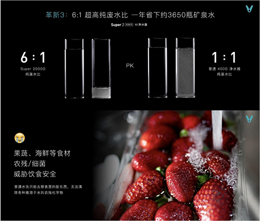 ?Super2 2000G云米·泉先AI凈水器不僅在清洗果蔬時能達到95.1%去農殘率,有效去除果蔬中的農殘、激素、防腐劑;在清洗海鮮時,更能達到99%除菌率有效去除海鮮中的細菌、有害添加劑,還原鮮甜本味。Super 2更采用炫彩大屏雙出水龍頭用水量、水質實時看得見,讓消費者不僅可以用得放心,更能吃得安心。