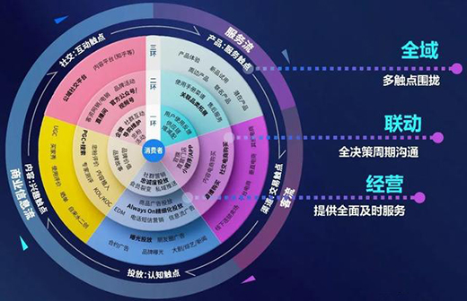 品牌在進行整套營銷動作中,要以消費者為核心,首先做到全域的多觸點觸達,即在公域流量池中圍攏消費者;從而產生與消費者的聯動,并與之進行全決策周期溝通;最后達成消費行為,并建立品牌私域,為消費者提供全面及時的服務。