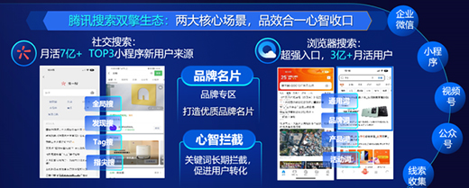 如今互聯網群體的搜索習慣正發生遷移轉變,出現移動化、社交化的趨勢。騰訊廣告通過社交搜索、瀏覽器搜索兩大核心場景,以數億級月活為依托,為商家打造品牌名片和進行心智攔截,促進消費轉化,實現品效合一。