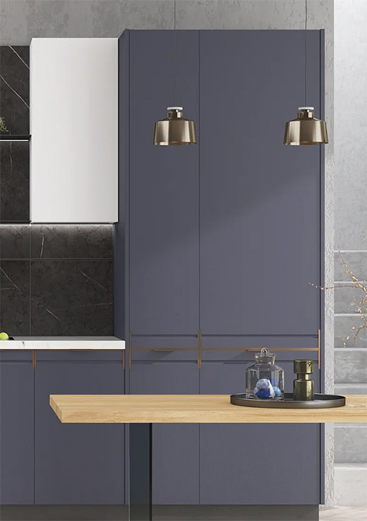 藍色,作為大海的顏色,給人類的心靈帶來平和與寧靜。新品「洱海」櫥柜在配色上對藍色的運用可謂精彩至極。櫥柜大面積地采用啞藍調,返璞歸真的純色讓人仿佛置身于暖熏和風,寧靜融融的海邊。