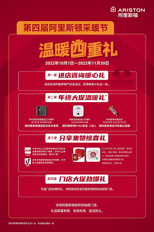 凡進店【4】咨詢阿里斯頓產品或活動的用戶,可享第一重進店咨詢暖心禮:贈送精美小禮品一份。凡購買阿里斯頓指定壁掛爐的用戶,可享第二重年終大促溫暖禮:購阿里斯頓進口冷凝爐(指定型號)贈熱水管家或小廚寶;購阿里斯頓壁掛爐(指定型號)贈反沖前置過濾器。凡在小紅書或抖音平臺按活動海報公示規則進行分享的用戶,可享第三重分享集贊驚喜禮。凡參與門店大促的用戶,還可享第四重門店大促勁爆禮。溫暖四重禮先到先得,送完即止!具體規則詳見活動海報,也可咨詢阿里斯頓授權經銷商門店。