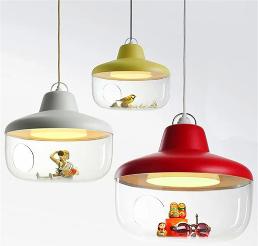 這是一款很超有愛的吊燈,整體是房屋的造型,透明燈罩,看起來像一間透明的房間。燈罩的側邊留有一個圓孔,可以把各種心愛的小物件放到這個“房間”里面去。因此它取名為“favourite things”。它可不是僅僅是一件裝飾品,因為同樣具備普通燈具的照明功能。而且完全不用擔心它會發熱,把你放在里面的心愛收藏品灼燒壞了。因為它的光源采用LED燈,日常使用的情況下,是不會過熱、發燙的。它獨特的造型,無論安裝在書房、餐廳、兒童房都是不錯的選擇。