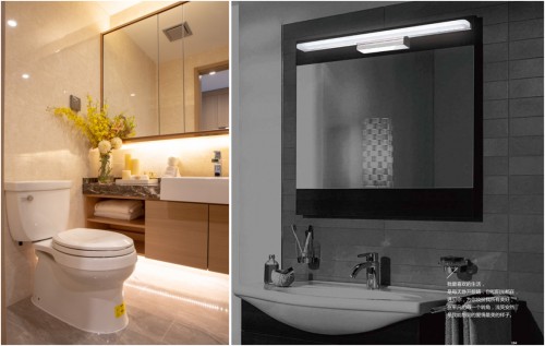 衛生間雖小,燈光設置可是大有名堂。燈光設置不合理,在鏡子前人臉會出現陰影,不方便化妝、刮胡子等。避免這樣的情況,可在鏡前區增加鏡前照明,讓光源均勻打在臉上。鏡柜下方放置洗浴用品的位置,同樣可以增設燈帶。