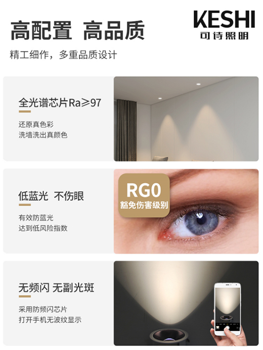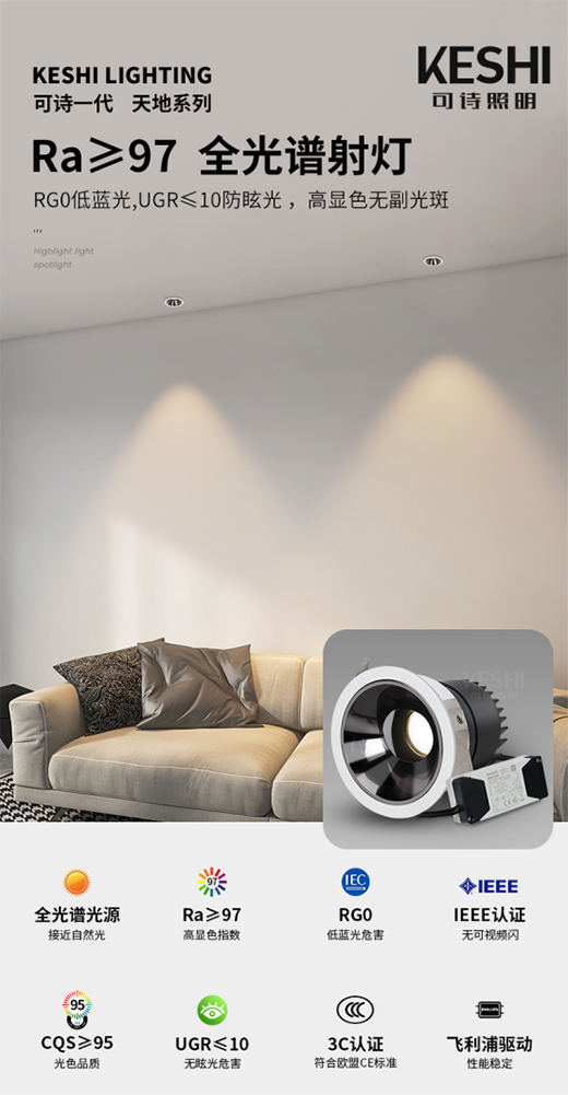 為了讓大家更好地理解,我們以KESHI可詩照明近期新推出的可詩一代-天地系列全光譜射燈為例,看看怎樣才稱得上是一盞好射燈。