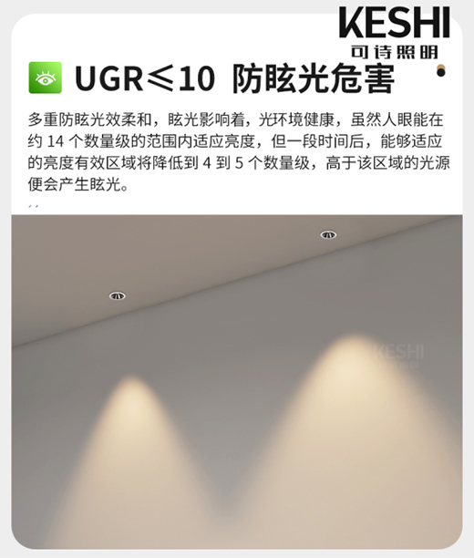 聚焦可詩一代-天地系列全光譜射燈的防眩能力,我們可以看到燈具采用了深筒防眩設計,將光源很好地隱藏起來,再則,搭配上防眩效果佳的可拆卸防眩杯及讓出光更柔和的光學透鏡,將該燈具的防眩效果發揮到更高的層次。通過測試,這款天地系列全光譜射燈UGR≤10,達到“無眩光感值”標準。在日常使用中,用戶感受不到眩光的存在,在這樣的光環境下用眼會更加舒適。