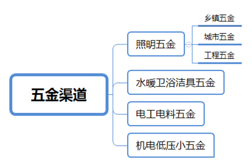 五金渠道是指以五金、建材等為主要銷售產品的銷售商組成的銷售渠道,其劃分方式也有多種。五金渠道按照“行業屬性”劃分,可以分為“照明五金、水暖衛浴潔具五金、電工電料五金、機電低壓小五金”四個大類別。照明行業常說的五金渠道主要指“照明五金”,而照明五金按照渠道屬性進行細分,可分為鄉鎮五金、城市五金、工程五金。