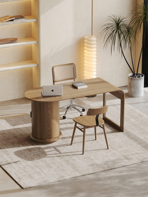 侘寂之美主張“不對稱主義”,呈現一種不對稱卻包容的美。空間布局簡約而隨意,滿足著最基本的功能需求,盡量保持布局中的“空”與極簡,呈現侘寂風的隨性之美。洛品有家此款不對稱書桌,一邊為具有儲物功能的圓柱柜子,一邊為支撐的長方體。曲線與直線的完美融合,整體呈現出一種分散卻又統一的不確定感,使空間視覺上更加柔和純粹。