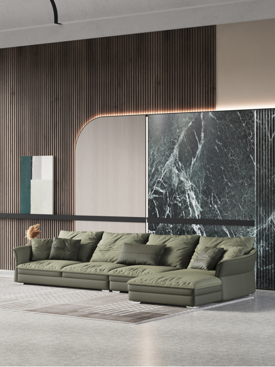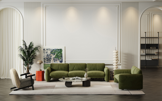淺綠色系是意式裝飾中的傳統色系。洛品這套布藝沙發從自然環境中汲取靈感,通過借鑒戶外的調色板為溫馨宜人的空間做點綴,意式極簡大理石茶幾充當“客廳顏值擔當”,讓客廳散發出優雅的氣息。柔和的垂柳綠色、沙色和銀灰色的大地色調將外部景觀引入室內,讓春日色彩在室內綻放光芒。