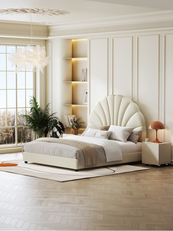 從工藝細(xì)節(jié)到視覺美感,無(wú)不彰顯著品質(zhì)感。洛品有家這款云慕系列軟體床,軟包床屏設(shè)計(jì)為貝殼形狀,象征人魚公主的堅(jiān)強(qiáng)、美麗,將浪漫腔調(diào)極致演繹,很適合主臥。款式新穎大氣,精細(xì)的做工和細(xì)膩的質(zhì)感可以搭配各種裝修風(fēng)格,出彩又不會(huì)過(guò)于夸張。