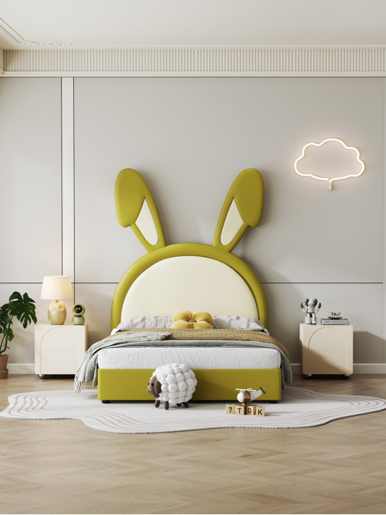 兔耳朵造型軟體床很適合放在兒童房,活潑可愛,簡(jiǎn)約的設(shè)計(jì),不添加累贅,讓人一眼看去就覺得舒適自然。加上卡通玩具的布置,充分體現(xiàn)了兒童天真活潑的特點(diǎn)。