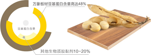 植物精粹,天然環保。精粹大豆活性蛋白,濃縮為性能優異的萬象豆基蛋白無醛生物質膠,摒棄傳統尿醛樹脂膠。板芯采用純天然、可再生的豆粕為原料,從源頭上保證零甲醛添加。