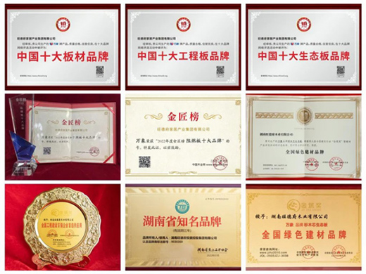經過23年的自立自強與艱苦奮斗,萬象品牌憑借過硬的環保品質、絕對的行業領導地位、良好的市場口碑,連續多年斬獲“中國影響力品牌”、“中國十大板材品牌”、“中國十大工程板品牌”、“中國十大健康板品牌”、“中國環境標志產品認證”、“家具板十大品牌”、“環保板材十大品牌”、“阻燃板十大品牌”、“全國綠色建材品牌”、“全國工程建設百強企業供應商”等多項榮譽稱號,為品牌實力加冕。回首23年的艱苦奮斗,心存感激,熱淚盈眶。展望未來的宏偉藍圖,初心不改,再續輝煌!