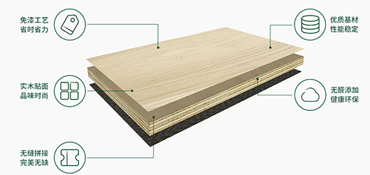 這款板材的飾面采用厚度達到0.5mm以上的珍貴天然木皮、染色木皮或科技木皮,立體感更強,紋理更清晰,裝飾效果更佳。而且采用厚皮無縫拼接技術,相較傳統薄皮手工貼面,具有無重疊、無離縫等特點,給您帶來完美體驗。