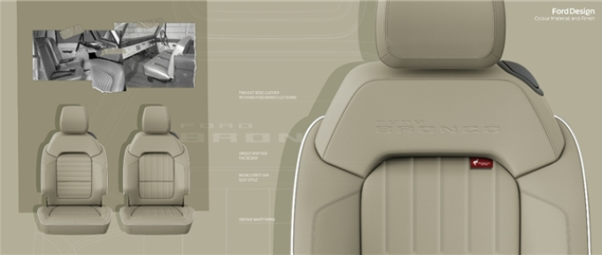 座椅的設計靈感源自初代福特烈馬,采用了垂直絎縫工藝,并在座椅邊緣使用定制牛津白(Oxford White)皮料緄邊包覆,營造出濃郁的復古氣息。座椅上一枚定制紅色刺繡標牌,更添手工定制般的細膩質感,彰顯對工藝的執著和匠心承諾。