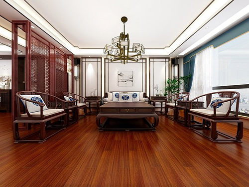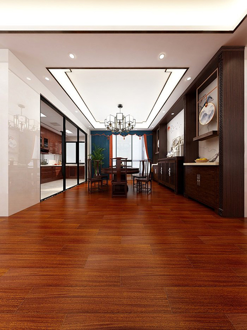 當古典氣韻延伸至起居環境之中,在古典山水意境中彰顯古樸韻味。一門到頂柜體,盡顯木材華美,裝得下家的美好。暗紅溫潤的木質地板,充滿著典雅的氣息。彈性適中,可疏通經脈。