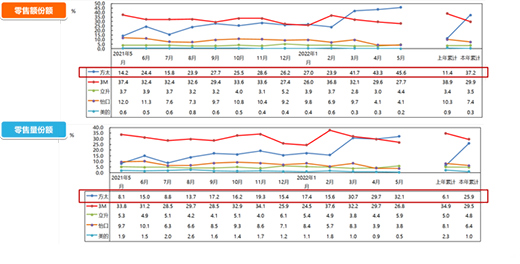 市場(chǎng)份額方面,方太在廚下凈水市場(chǎng)的零售額與零售量份額自2020年4月的0.19%、0.06%飛速提升至2022年5月的45.6%與32.1%。
