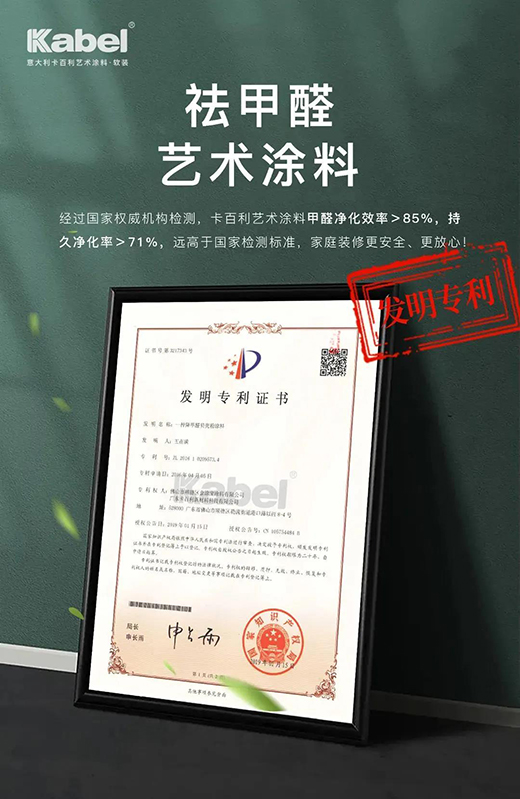 早在2018年,為給消費者呈現一個健康舒適的家居環境,卡百利便加大資金投入,自主研發降解甲醛技術,在乳液聚合階段把吸醛功能單體化學接枝到乳液大分子上,賦予乳液吸醛功能,并且乳液的這種吸醛功能是通過與甲醛發生化學反應方式進行,反應迅速,降醛效率高,該項降解甲醛技術已在2019年獲得國家發明專利。經過國家權威機構檢測,卡百利藝術涂料甲醛凈化效率>85%,持久凈化率>71%,遠高于國家檢測標準。