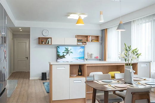 進(jìn)門就是客廳,通屋大面積的選用了白色,加上幾扇大窗戶的光照充足,導(dǎo)致進(jìn)戶格外的明亮??蛷d中間做吧臺,看似雞肋卻發(fā)揮大作用,隔斷、沙發(fā)墻、收納一體。吧臺將客廳分隔開,功能獨立空間通透。沙發(fā)也有了倚靠,更有安全感。