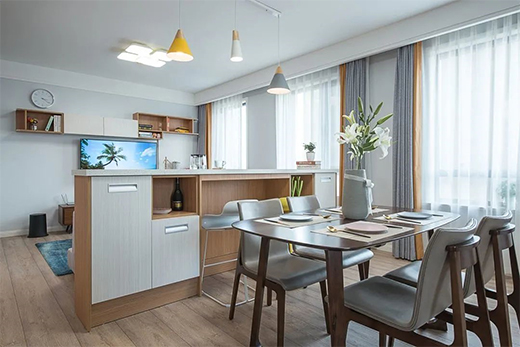 吧臺靠近餐廳一側(cè),擁有儲物功能,可以充當(dāng)小型餐邊柜收納一些餐廳用品。中間鏤空設(shè)計提高座位舒適性,搭配兩把簡易吧臺椅,簡約有范。客餐廳采光好,窗簾依照功能區(qū)獨立設(shè)計,灰白色簡約時尚。