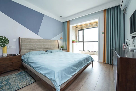 主臥簡潔清爽,背景墻格外設(shè)計了幾何造型,深藍(lán),淺藍(lán)的組合,讓空間變得干練。幾何造型造價便宜,而且簡單大方又不呆板,性價比極高。陽臺與臥室連通,增加視覺寬敞與通透。窗簾安裝很美觀,顏色與主臥格調(diào)也很配。