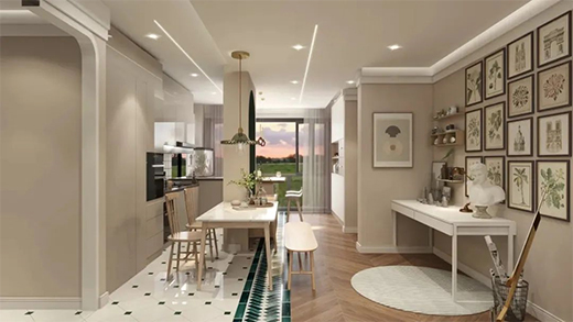餐廳采用暖米色為主調(diào),餐桌上方的燈具提升了空間的設(shè)計感,搭配木質(zhì)的家具形成一個簡單又溫馨感十足的就餐環(huán)境。