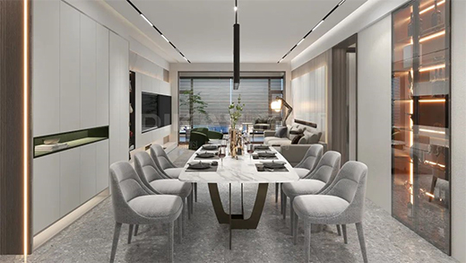 「卡瑪拉」豐富而生動的觸感,毫無矯飾的不規則元素,緩解了空間單調乏味,高級灰調,帶來別致輕奢感,時尚的質感生活在此刻定格。