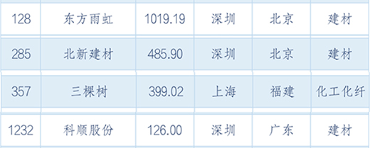 榜單顯示,東方雨虹憑借1019.19億元的市值位列第128位,北新建材以485.9億元的市值位列285位,三棵樹以399.02億元的市值位列第357位,科順股份以126億元的市值位列第1232位。
