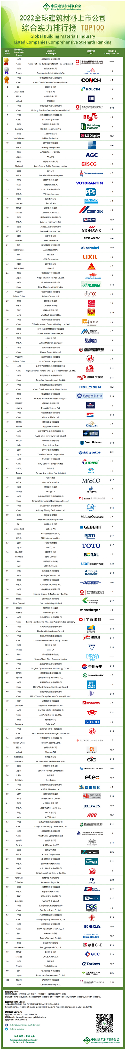 11月17日,由中國建筑材料聯合會主辦的全國建筑材料行業碳達峰推進大會、2022年全國建筑材料行業大會、全國建筑材料行業科技創新大會暨聯合會專家委員會工作會議在京召開。會上公布了“2022全球建筑材料上市公司綜合實力排行榜”。