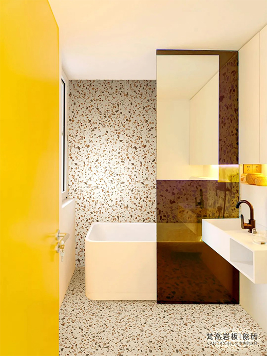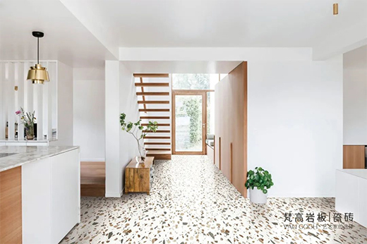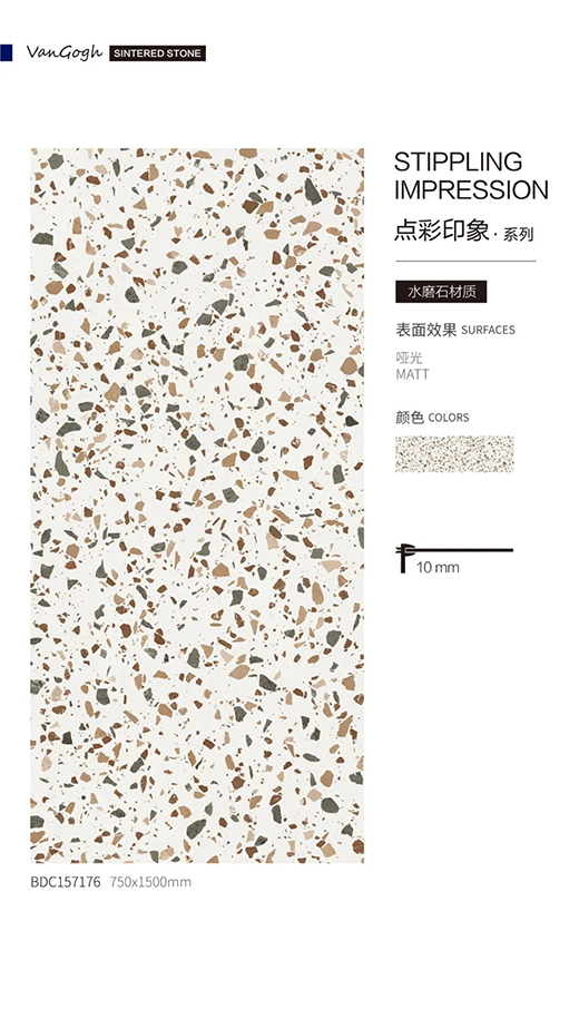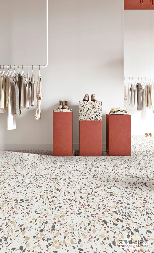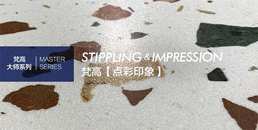 梵高【點彩印象】,從修拉的作品中獲取靈感,將「點彩藝術」技法融入到「彩色水磨石」肌理的重構當中,不規則的純色顆粒,像油畫色點散落在磚面,看似漫不經心,實則色澤、大小和分布均經由精心設計,繽紛爛漫,又富于藝術氣息。