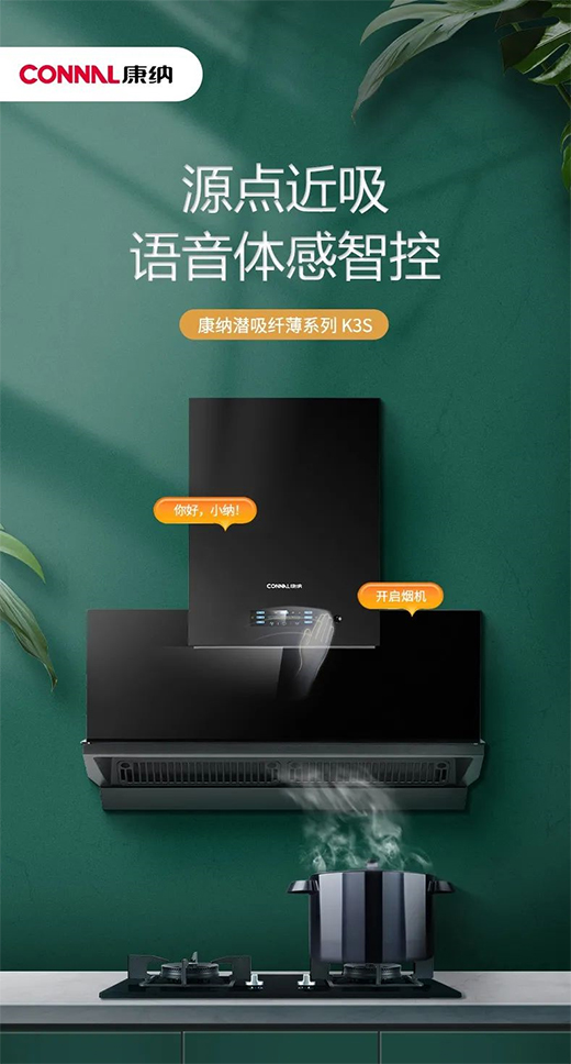 康納團隊耗時一年打造大吸力K3S油煙機。這款明星產品采用潛吸式跨界設計,低位攔截油煙,解決廚房油煙問題,帶來清新空氣。23m3/min的大風量搭載450Pa強排風壓,無論樓層多高都能暢通無阻。此外,K3S采用全新智能體感+AI語音智控,還附帶一鍵自動清洗、保溫置物臺等多動能、人性化的設計。
