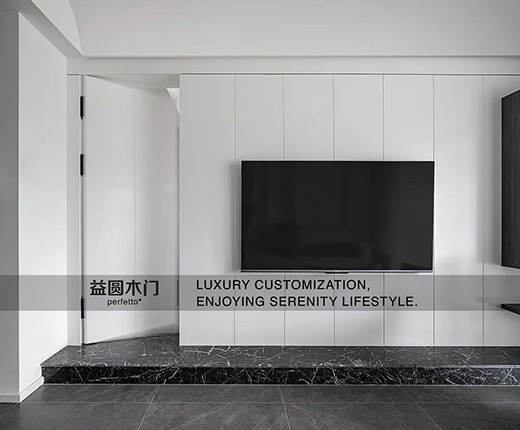 電視背景墻保持光滑潔凈的的表面,在光線中閃耀或是朦朧。繁簡相融,在白色的電視背景墻側,臥室的房門以隱形的形式融入墻面,門的輪廓線按既定韻律與墻面線條重合,隱形感被再次強化,通過統一的整體來表現簡約的“韻律”。