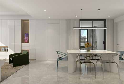 作為客廳視覺延續(xù)的開放式廚房,餐桌選擇與整屋裝修色調(diào)統(tǒng)一的白色,以亮眼的桌椅點綴空間,使整個餐廚區(qū)域與客廳區(qū)域更加協(xié)調(diào)。