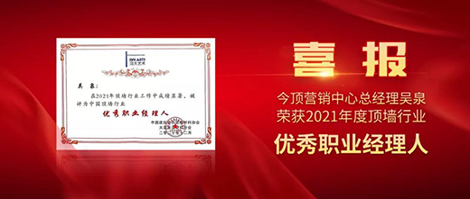 這些榮譽同樣離不開做出貢獻的團隊和個人,在2021年中國頂墻行業年會上,今頂董事長周建成榮獲“2021年度中國頂墻行業風云人物”;今頂副總經理華偉榮獲“2021年度頂墻行業先進工作者”;今頂全國營銷總監吳泉榮獲“2021年度頂墻行業優秀職業經理人”;今頂(運城)門店榮獲“2021年度頂墻行業五星級示范店”;今頂(石家莊)門店穆亞鵬榮獲“2021年度頂墻行業優秀經銷商”。