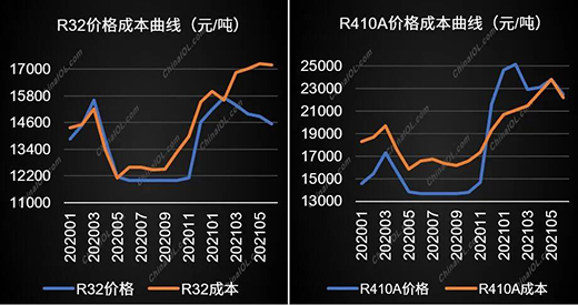 據產業在線統計,2020年以來,熱門產品R32單噸虧損2000千元上下,而R410a也是受到今年的政策影響才進入止損區間,市場倒掛現象明顯。
