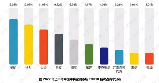《中央空調(diào)市場》發(fā)布的數(shù)據(jù)顯示,2022年上半年,美的以16.03%的市場占有率位居行業(yè)首位,在離心機、螺桿機、模塊機組等冷水機產(chǎn)品中,美的市場占比均保持國產(chǎn)品牌領(lǐng)先。從跟隨者到領(lǐng)導(dǎo)者,從技術(shù)引進到技術(shù)創(chuàng)新,美的不斷刷新著中央空調(diào)行業(yè)的“高度”,引領(lǐng)“中國智造”的發(fā)展。